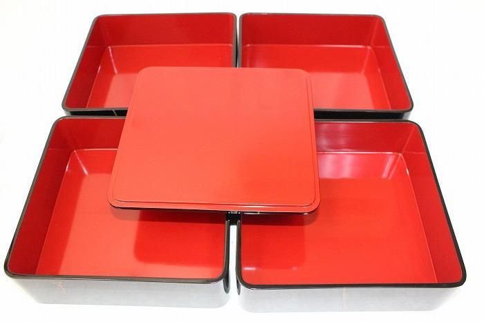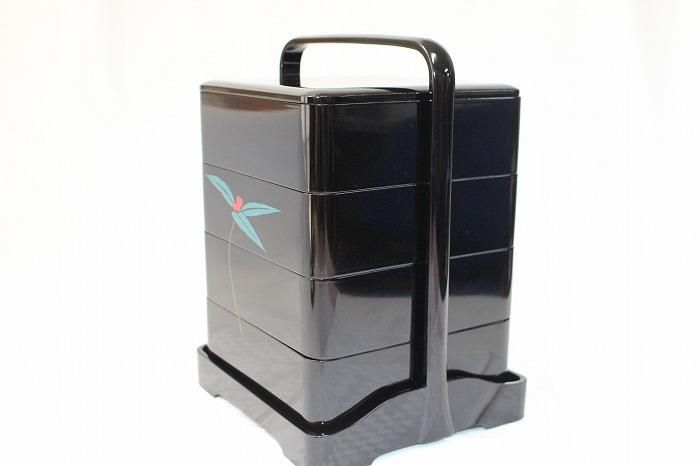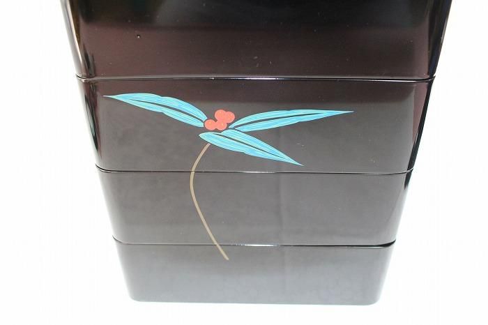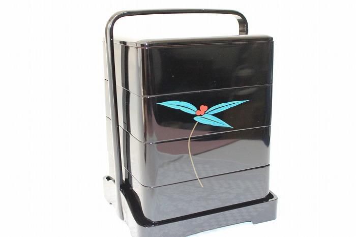 輪島塗本木地造色漆千両花文蒔絵付四段御重弁当箱仕様 石川無形文化財小松芳光作