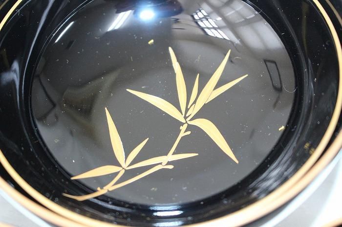 備考 加賀蒔絵伝承者、蒔絵師寺尾玉峰の作品です。蓋内に松竹梅菊菖蒲の五君子が蒔絵されています