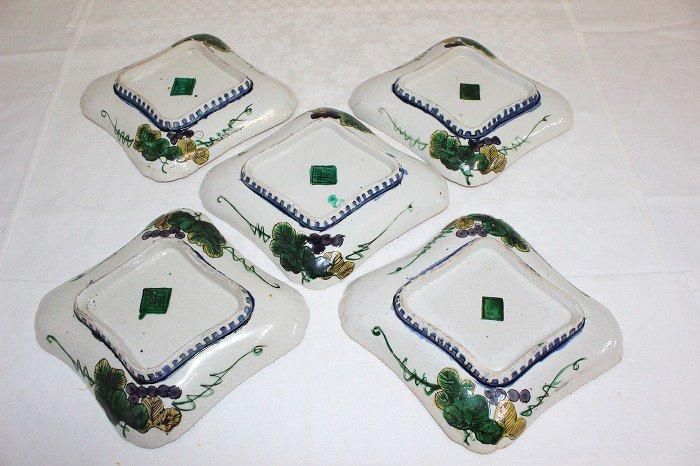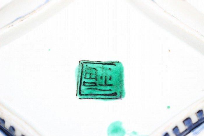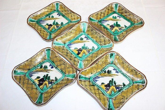 九谷明治手青手染付風景文菱形向付全5客揃え 角福印