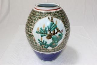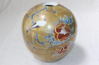 九谷焼色染付柘榴花鳥文花瓶 九谷昭和の名工藤村豊秋作