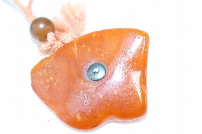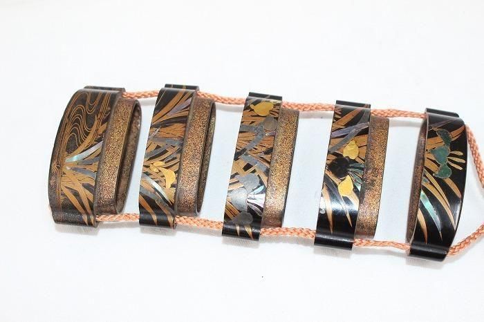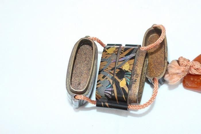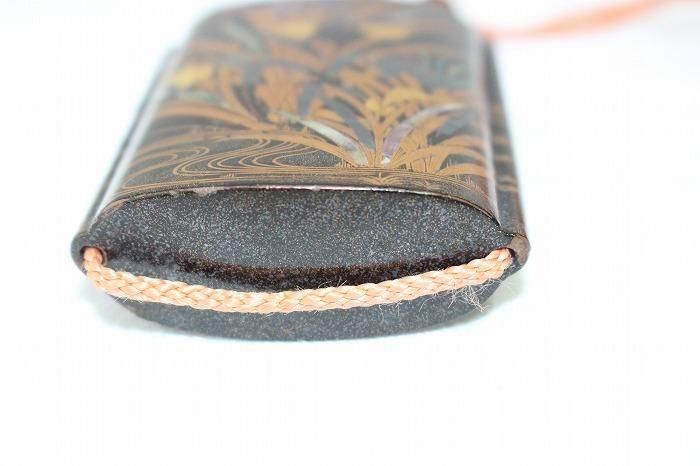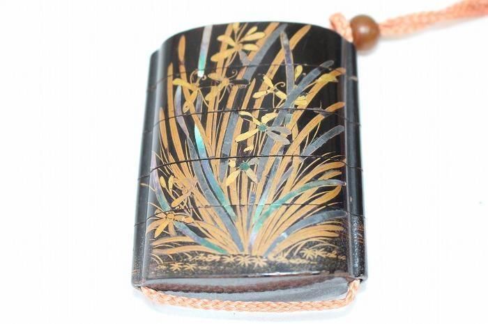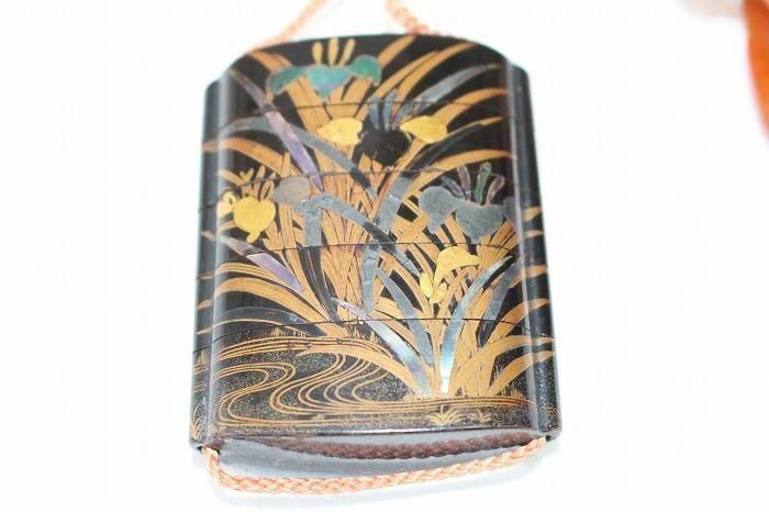 古い印籠内梨地四層菖蒲文蒔絵 メノウ石根付付