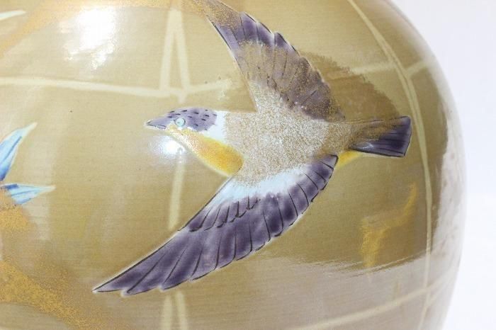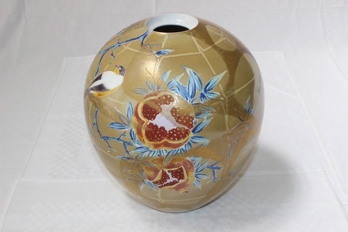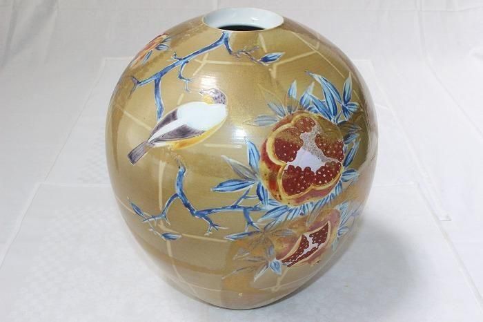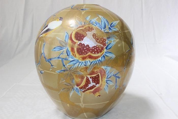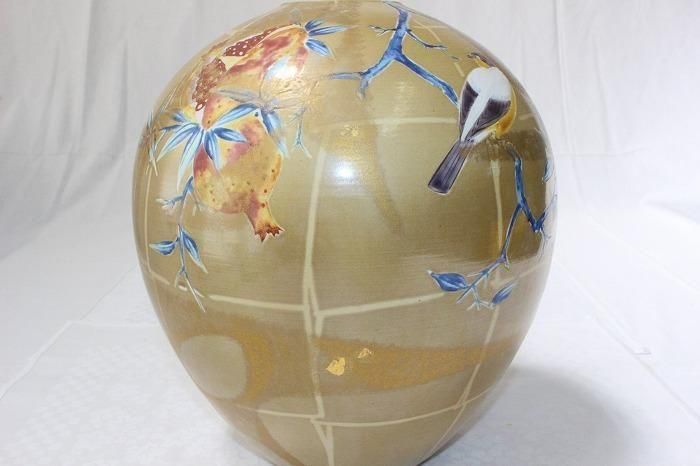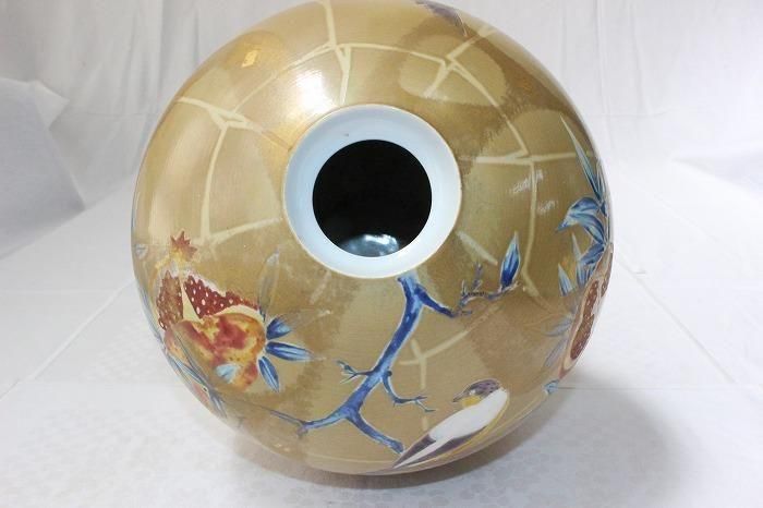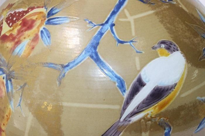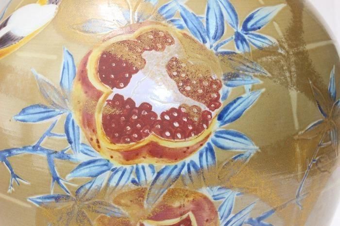 九谷焼色染付柘榴花鳥文花瓶 九谷昭和の名工藤村豊秋作