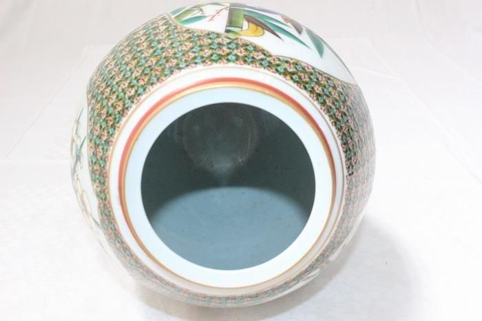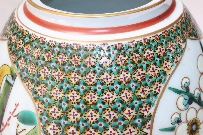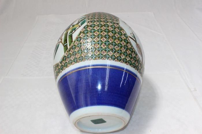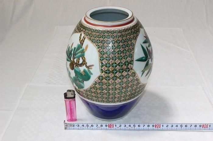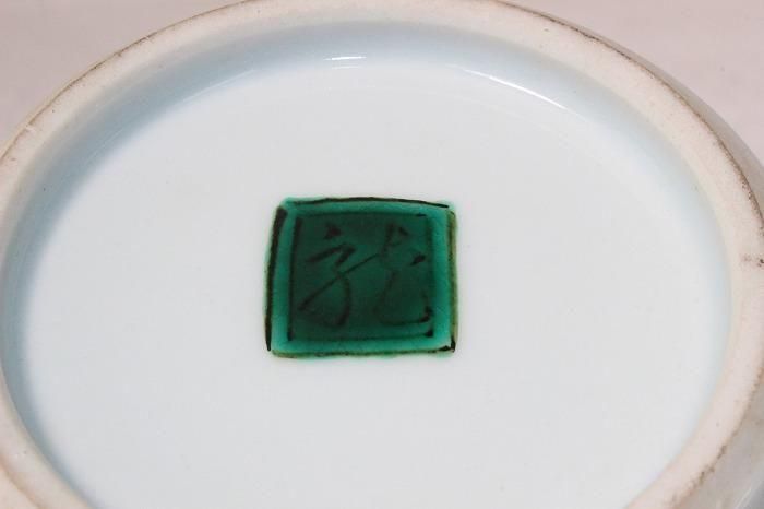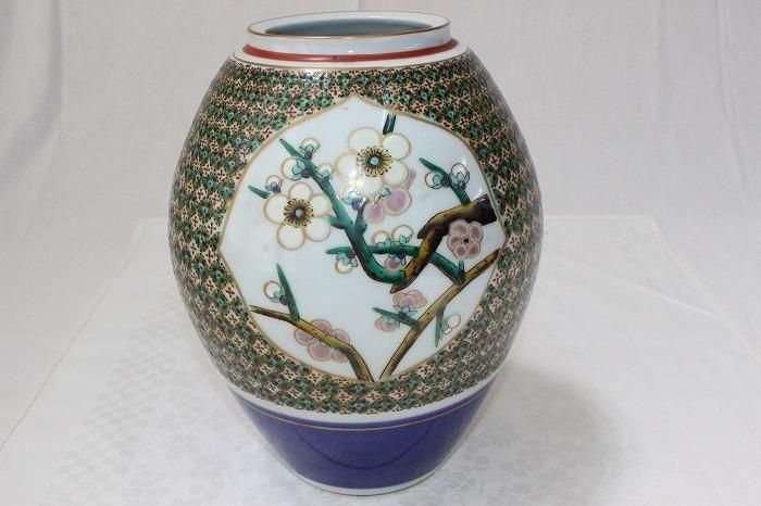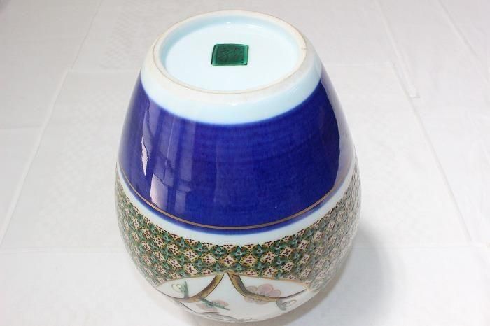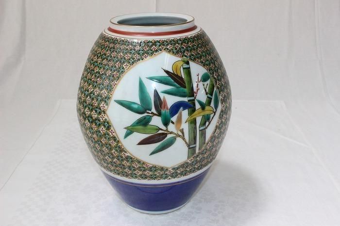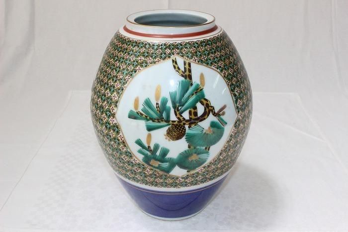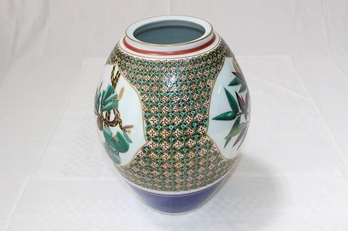 九谷焼色染付小紋松竹梅文花生け 河上龍三作