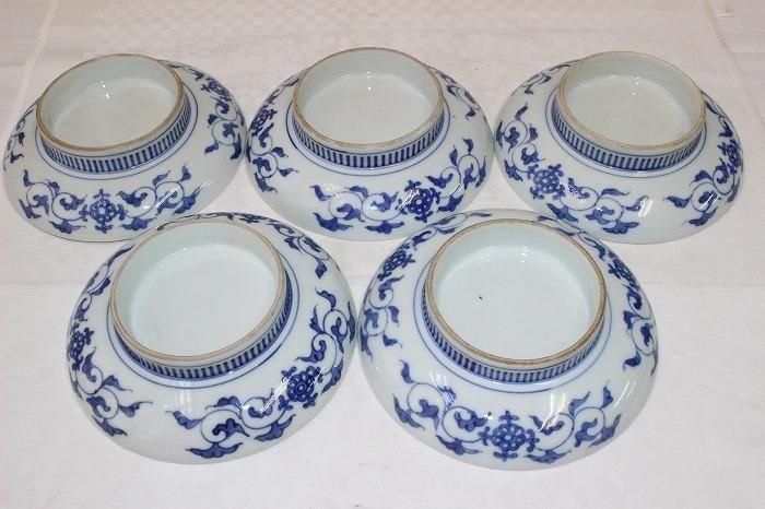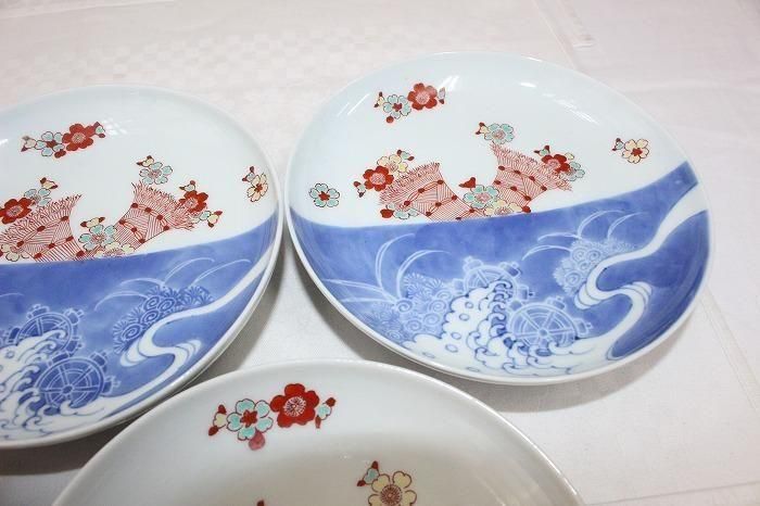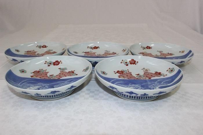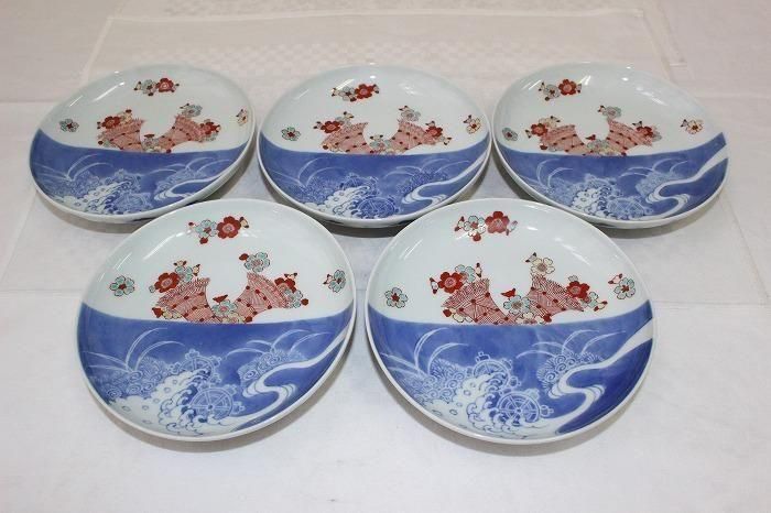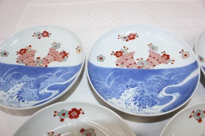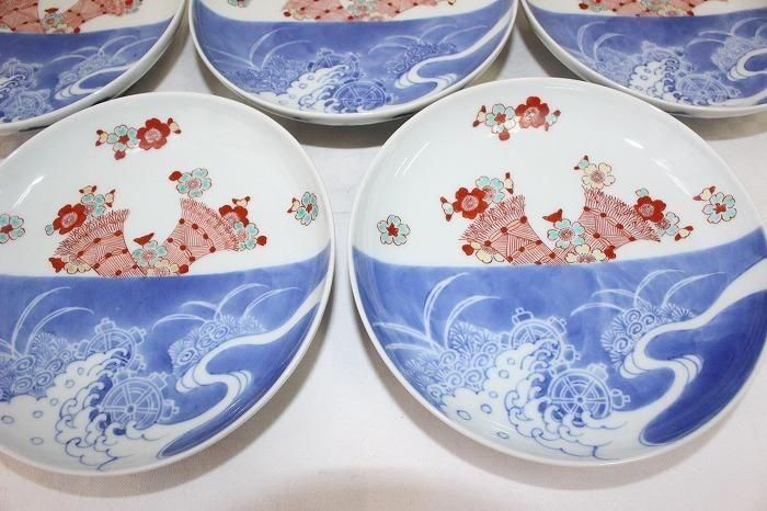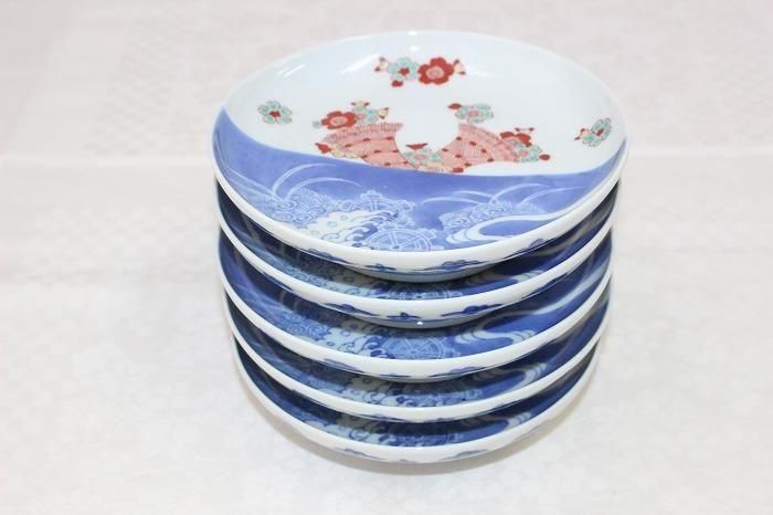 色鍋島復刻染付波花文五寸高台皿全五客揃え