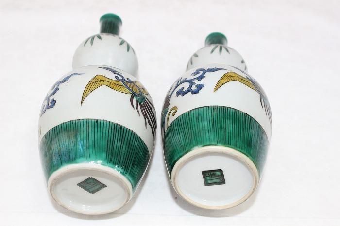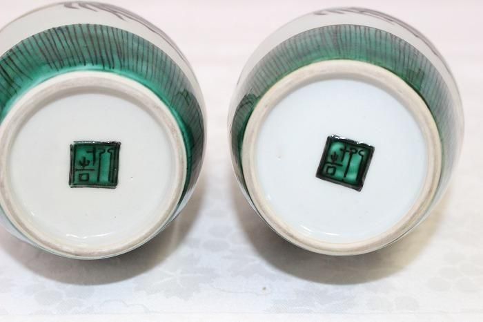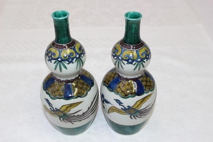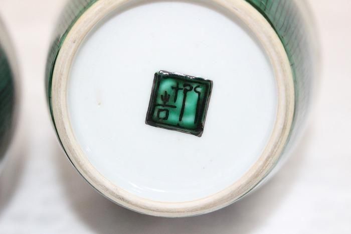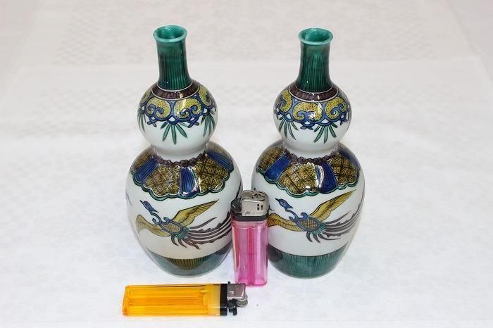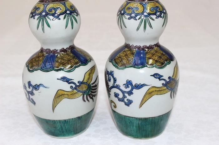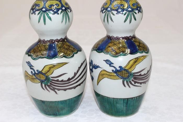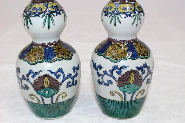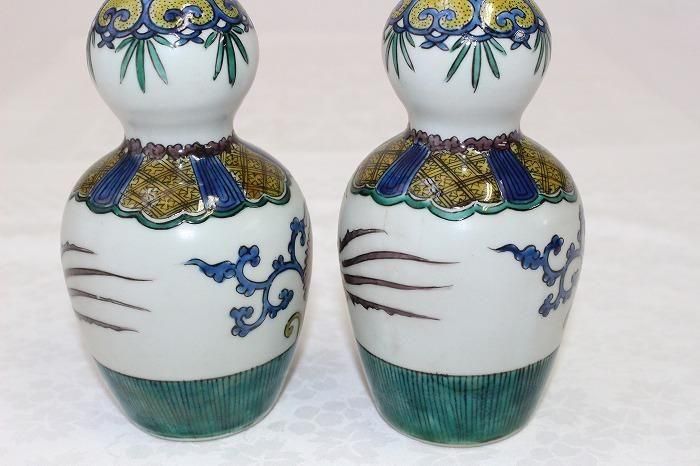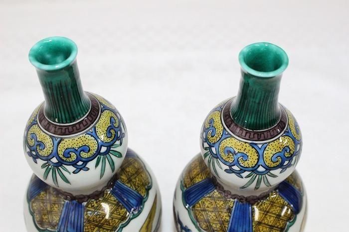 九谷焼色染付小紋格子文瓢形徳利一対 日展作家加登明雄造