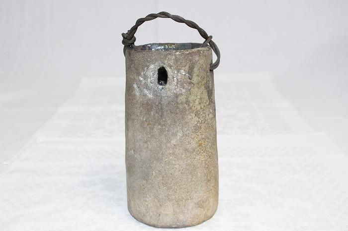 備考 戦後辺りに焼かれた大樋脇窯春日山窯、初代開発文七作の掛花入れです。口耳部の弦を補強するため銅線にて止めてあります。(写真)