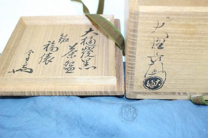 備考 名工大樋九代長左衛門作黒楽茶碗です。銘「福俵」極め裏千家今日庵です。