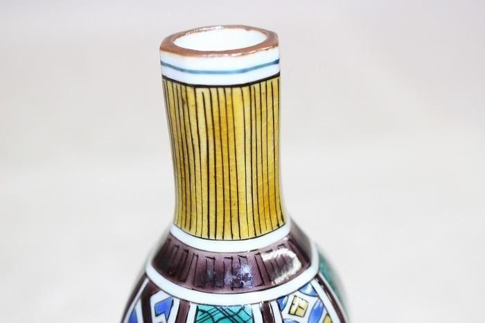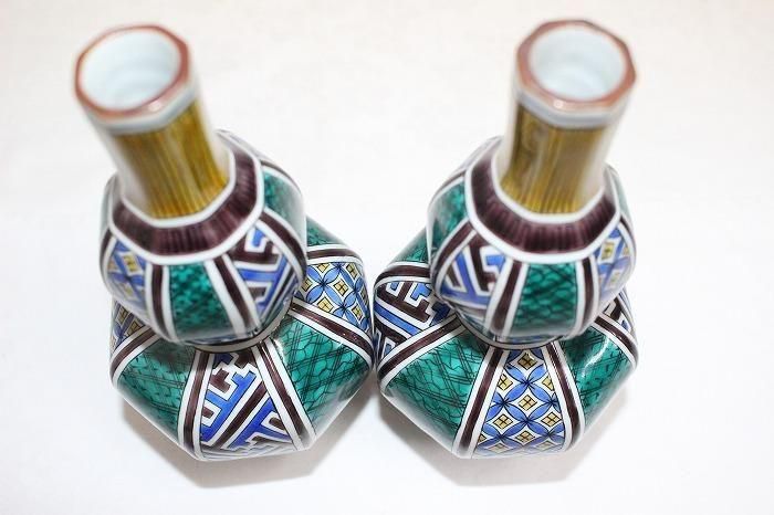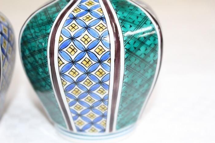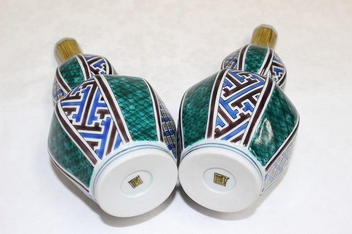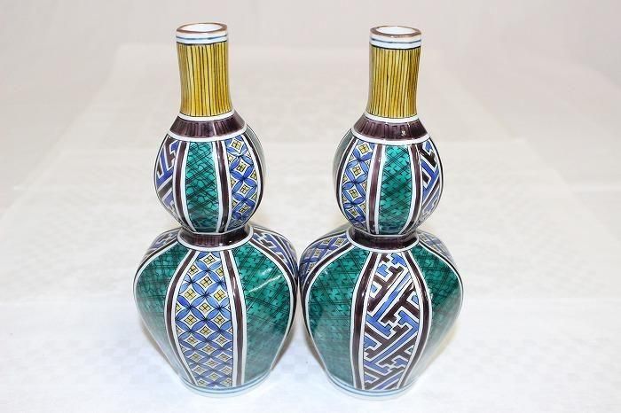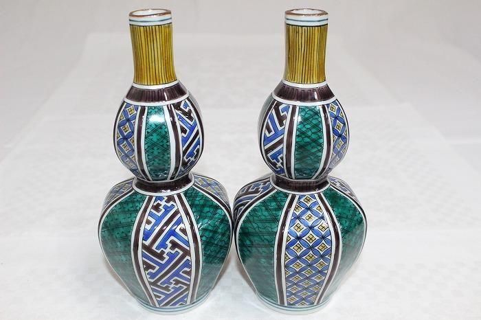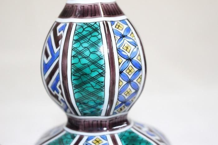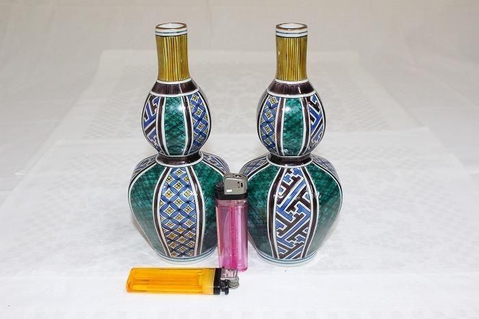 九谷焼色染付小紋格子文瓢形徳利一対 日展作家加登明雄造