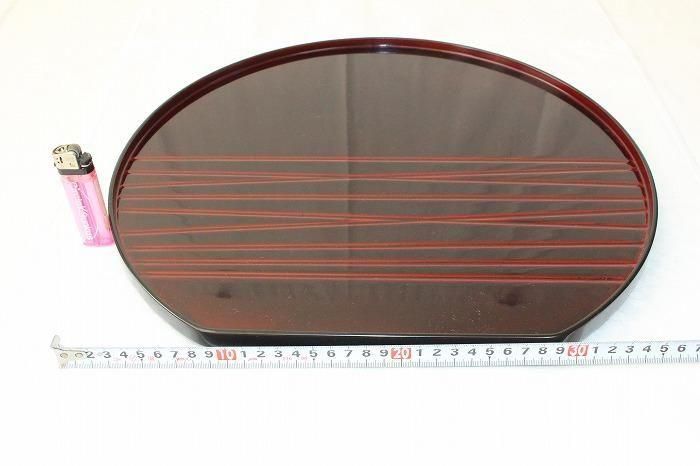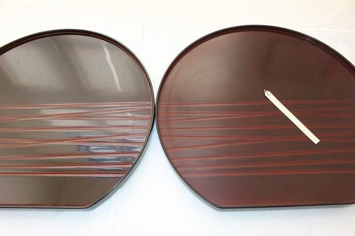 備考 輪島大徹漆器謹製の溜塗卓上御膳半月盆です。展示品の為上部一客だけ微小のクスミが見られますので安価にての販売です。
